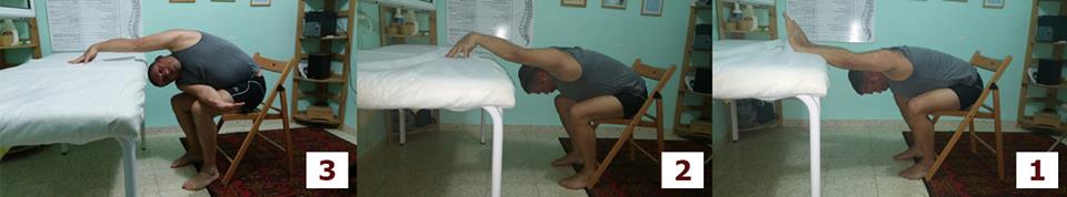 ב. לשאר באותו מרחק מן השולחן ולהסתובב עם הגוף לצד שמאל ולשים את כתף ימין על רגל ימין ואת יד שמאל למתוח על השולחן כמו שניתן לראות בתמונה מספר 3. ולאחר מכן לעשות את אותו הדבר לצד הנגדי. אתה יודע שעשית את התרגיל נכון כאשר אתה מרגיש את הגוף נמתח בשני הצדדים.